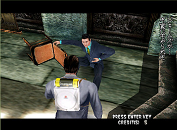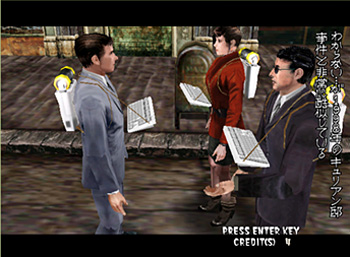 左下の、なにか妙なものを背中にしょってるスーツが主人公(操作キャラ)